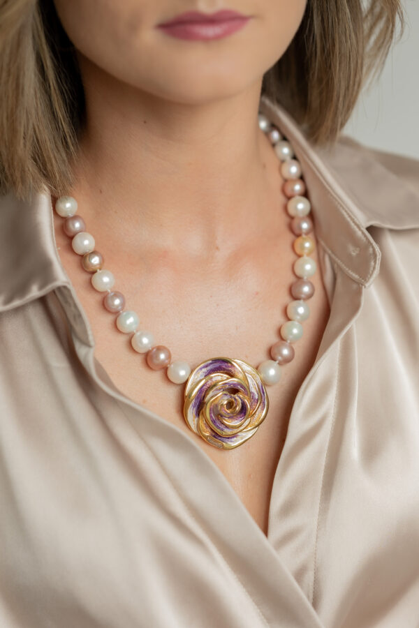 Wyjątkowy naszyjnik wykonany z naturalnych pereł w odcieniach bieli i łososiowego różu, ozdobiony złotą zawieszką w kształcie kwiatu róży. Zawieszka została pokryta wielokolorową emalią, dzięki czemu zachwyca subtelną grą barw i nowoczesnym wykończeniem. To biżuteria, która łączy klasyczną elegancję pereł z romantycznym, artystycznym charakterem kwiatowego wzoru. Idealny wybór na prezent lub jako uzupełnienie wyjątkowych stylizacji. Zapraszamy do zakupu!