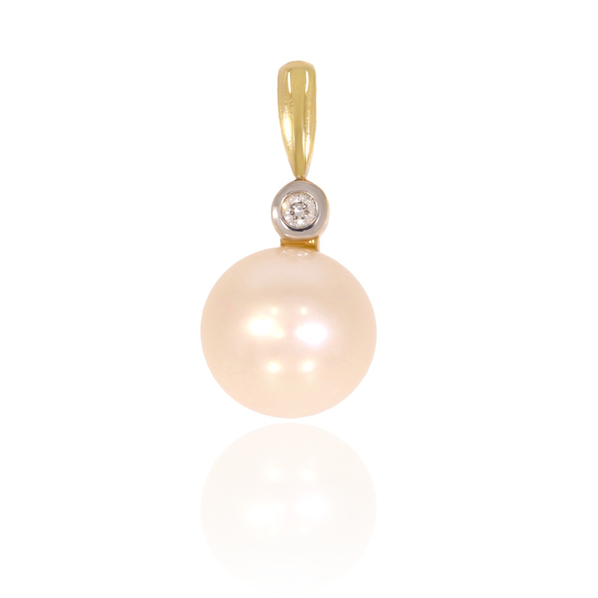 Złota zawieszka z perłą hodowlaną i brylantem próby 585. Piękna, ponadczasowa zawieszka wykonana ze złota, ozdobiona szlachetną perłą hodowlaną, której miękki, perłowy blask nadaje całości wyjątkową delikatność. Perła została oprawiona w starannie wykończone złoto, co podkreśla jej naturalny urok i elegancję. Dodatkowego blasku kompozycji dodaje brylant, precyzyjnie oprawiony w górnej części zawieszki. Jego subtelna, świetlista gra ze światłem pięknie kontrastuje z gładką powierzchnią perły, tworząc harmonijne i niezwykłe szykowne połączenie. Zawieszka zachwyca swoją klasyczną formą, dzięki czemu sprawdzi się zarówno jako codzienna ozdoba, jak i element biżuterii na wyjątkowe okazje. To idealny wybór dla osób ceniących elegancję, kobiecość i ponadczasowy styl, a także doskonały pomysł na wyjątkowy, pełen klasy prezent. Zapraszamy do zakupu!