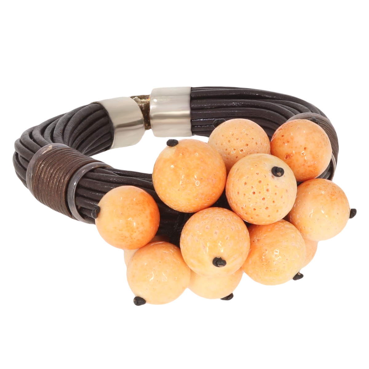 Efektowa bransoletka wykonana z kulek koralowca, osadzonych na splecionych rzemieniowych sznurach, które nadają całości surowego, a jednocześnie eleganckiego charakteru. Intensywna barwa koralowca pięknie kontrastuje z naturalną fakturą rzemienia, tworząc unikalną i przyciągającą wzrok kompozycję.
