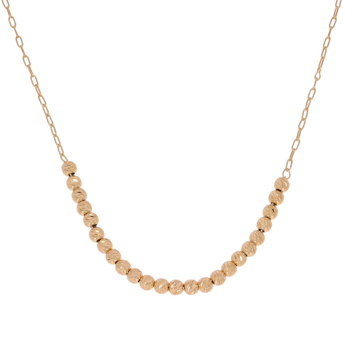 Srebrny pozłacany naszyjnik próby 925. Elegancki i subtelny naszyjnik wykonany ze srebra, pokryty wysokiej jakości złoceniem. Jego główną ozdobą są drobne, precyzyjnie grawerowane kulki, które pięknie odbijają światło i nadają biżuterii wyjątkowego blasku. Delikatna forma sprawia, że naszyjnik prezentuje się niezwykle kobieco i stylowo. To idealny dodatek zarówno na co dzień, jak i na specjalne okazje. Świetnie komponuje się z innymi pozłacanymi elementami, tworząc modne, warstwowe stylizacje. Dzięki uniwersalnemu designowi będzie również doskonałym pomysłem na prezent dla każdej miłośniczki subtelnej, eleganckiej biżuterii. Dodaj swojej stylizacji odrobinę luksusu i ponadczasowego szyku dzięki temu wyjątkowemu naszyjnikowi z grawerowanymi kulkami. Zapraszamy do zakupu!