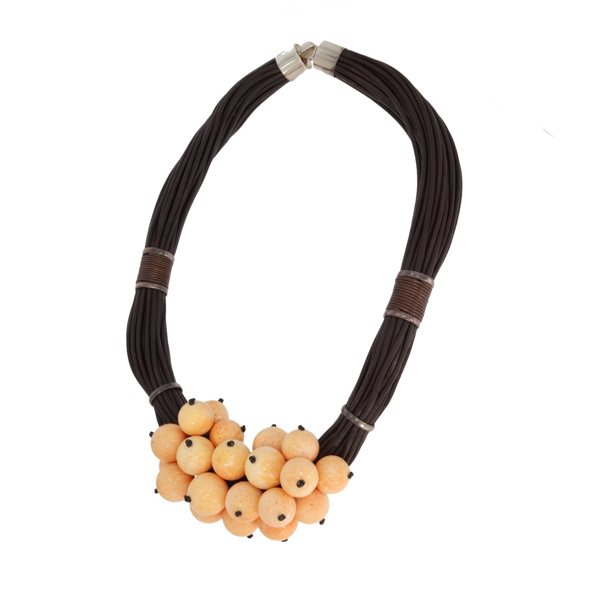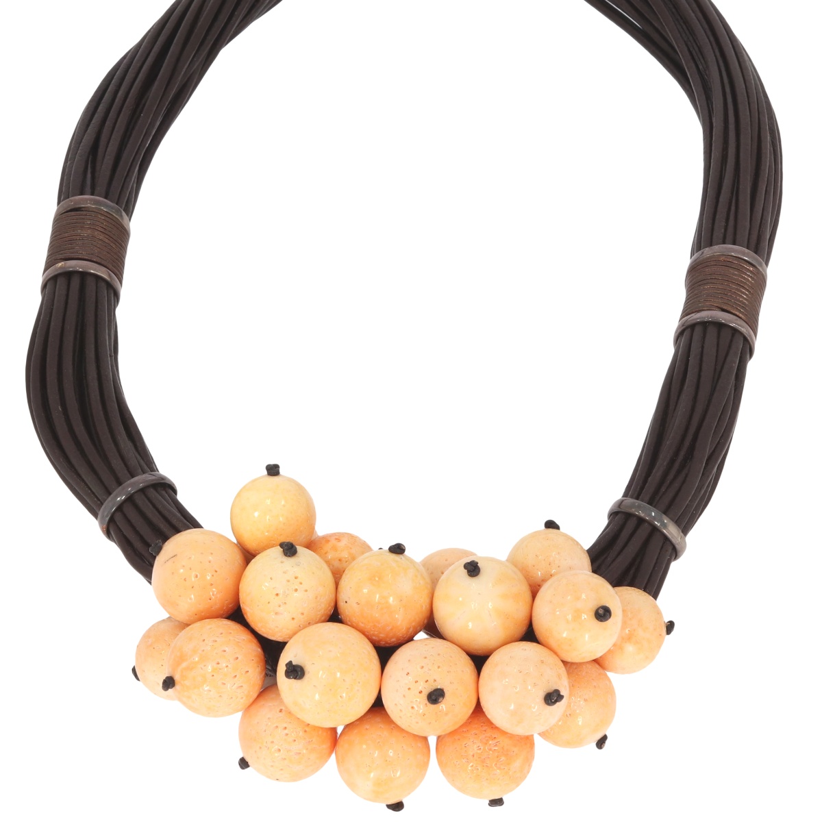 Efektowny naszyjnik wykonany z kulek koralowca, osadzonych na splecionych rzemieniowych sznurach, które nadają całości surowego, a jednocześnie eleganckiego charakteru. Intensywna barwa koralowca pięknie kontrastuje z naturalną fakturą rzemienia, tworząc unikalną i przyciągającą wzrok kompozycję.