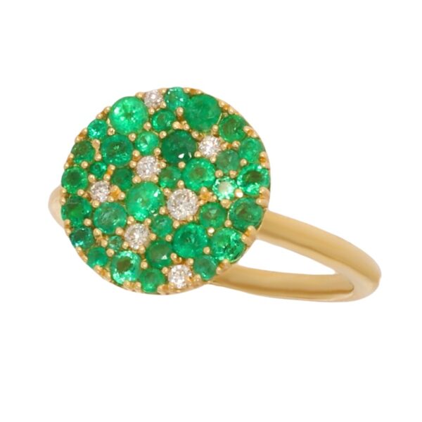 Złoty pierścionek z szmaragdami i brylantami próby 750. Elegancki pierścionek wykonany z najwyższej jakości złota, stworzony z myślą o kobietach ceniących klasykę w nowoczesnym wydaniu. Subtelna i pełna lekkości forma biżuterii, w której naturalne szmaragdy o głębokiej zieleni oraz brylanty o olśniewającym blasku zostały rozmieszczone w artystyczny, nieregularny sposób. Efekt „rozsypania” kamieni nadaje całości nowoczesny, pełen wdzięku charakter, jednocześnie zachowując szlachetną elegancję. To kompozycja, która przyciąga wzrok grą świateł i kolorów, tworząc wrażenie delikatnej mgiełki drogocennych klejnotów. Pierścionek idealny dla osób ceniących unikatowy design i niepowtarzalny urok biżuterii artystycznej. Zapraszamy do zakupu!