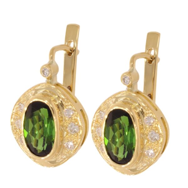 Złote kolczyki z turmalinem i brylantami próby 585. Zjawiskowe kolczyki, które łączą w sob8ie ponadczasową elegancję i mistrzowskie rzemiosło jubilerskie. Wykonane ręcznie z najwyższą precyzją ze złota próby 585, zdobione naturalnymi turmalinami o intensywnej barwie oraz lśniącymi brylantami, które dodają całości wyjątkowego blasku. Kolczyki dostępne w edycji limitowanej, co czyni je doskonałym wyborem dla osób ceniących luksus i indywidualny styl. Te kolczyki idealnie podkreślą wieczorową stylizację, ale będą również wyjątkowym dodatkiem na co dzień dla miłośniczek eleganckiej biżuterii. Zapraszamy do zakupu!