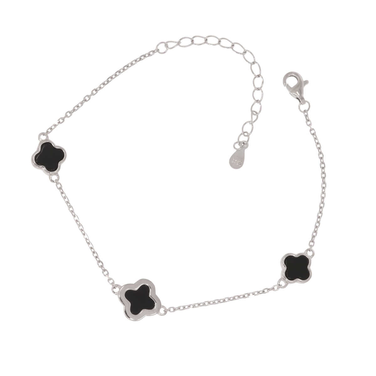 Srebrna bransoletka z czarnymi koniczynkami próby 925. Delikatna srebrna bransoletka ozdobiona ciemnymi koniczynkami to biżuteria, która zachwyca subtelnym blaskiem i nowoczesnym stylem. Świetnie sprawdzi się w codziennych stylizacjach, dodając im klasy i elegancji. To wyjątkowy dodatek w ponadczasowym wydaniu, idealny również jako prezent dla bliskiej osoby. Połączenie prostoty i nowoczesności sprawia, że bransoletka będzie ulubionym elementem biżuterii na wiele okazji. Zapraszamy do zakupu!