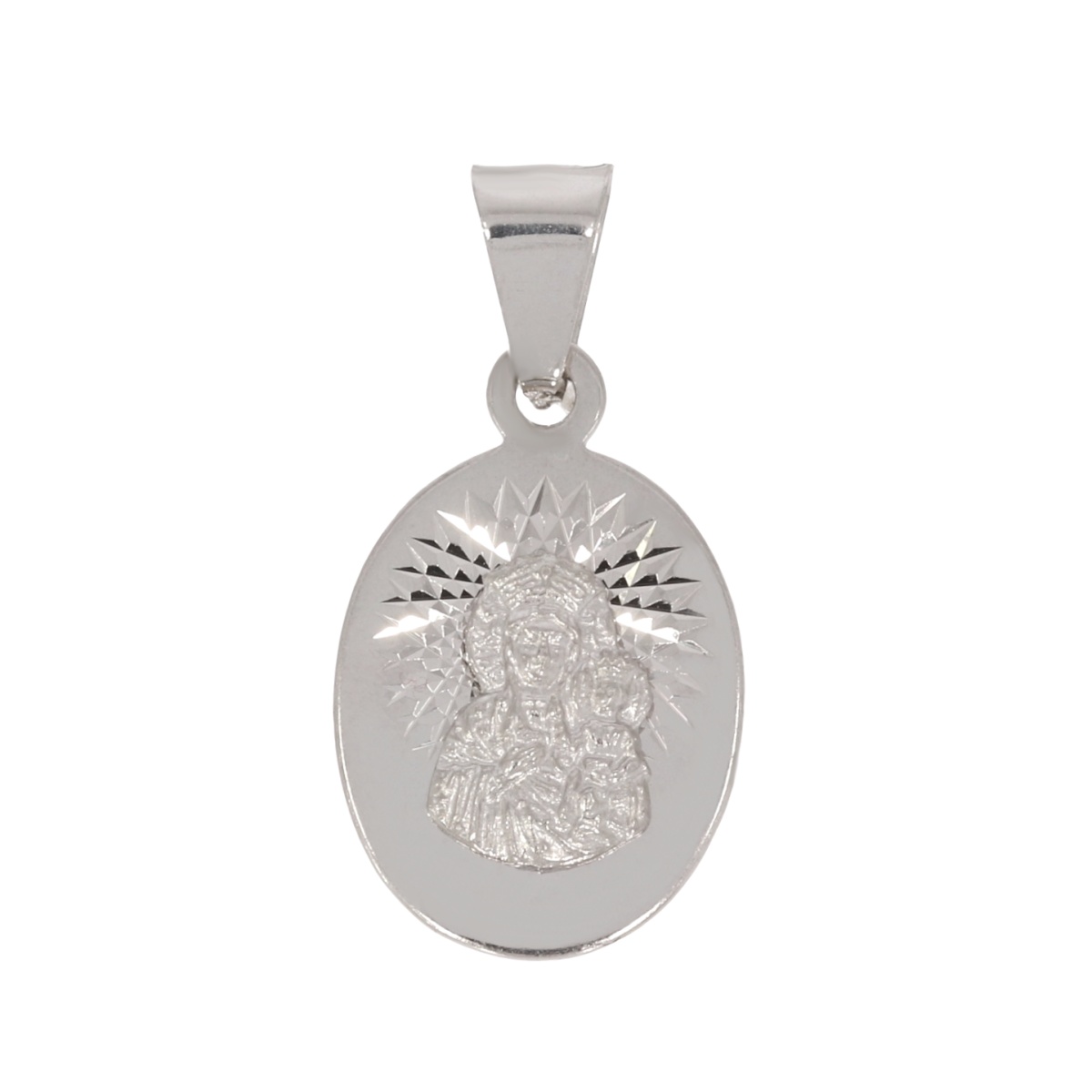 Srebrny medalik z wizerunkiem Matki Bożej Częstochowskiej z Dzieciątkiem Jezus to biżuteria o głębokim znaczeniu religijnym i duchowym. Inspiracją jest cudowny obraz z Jasnej Góry- jeden z najważniejszych symboli wiary w Polsce. Wizerunek Maryi tulącej Dzieciątko przypomina o miłości, opiece oraz nieustannej obecności Boga w codziennym życiu.